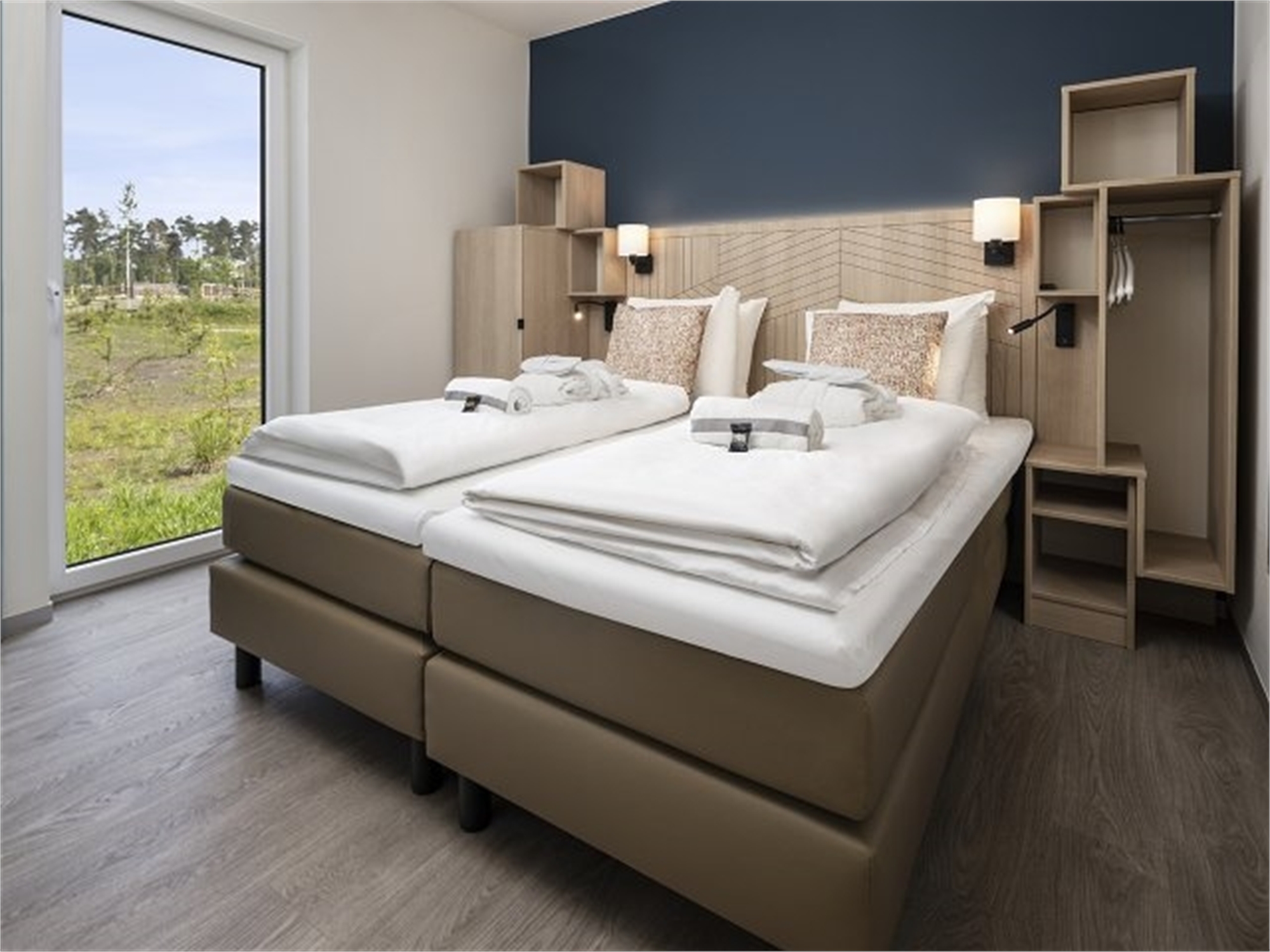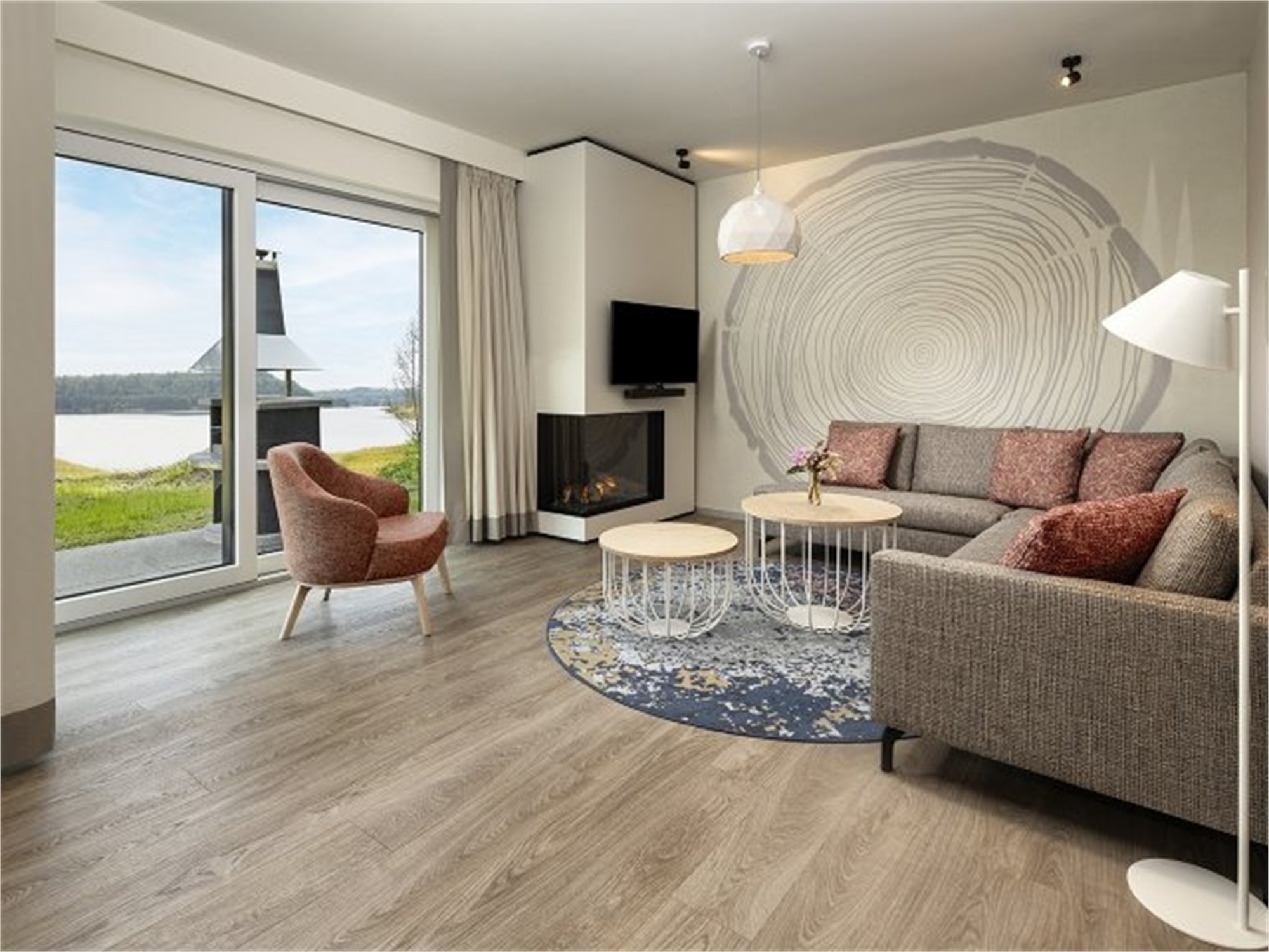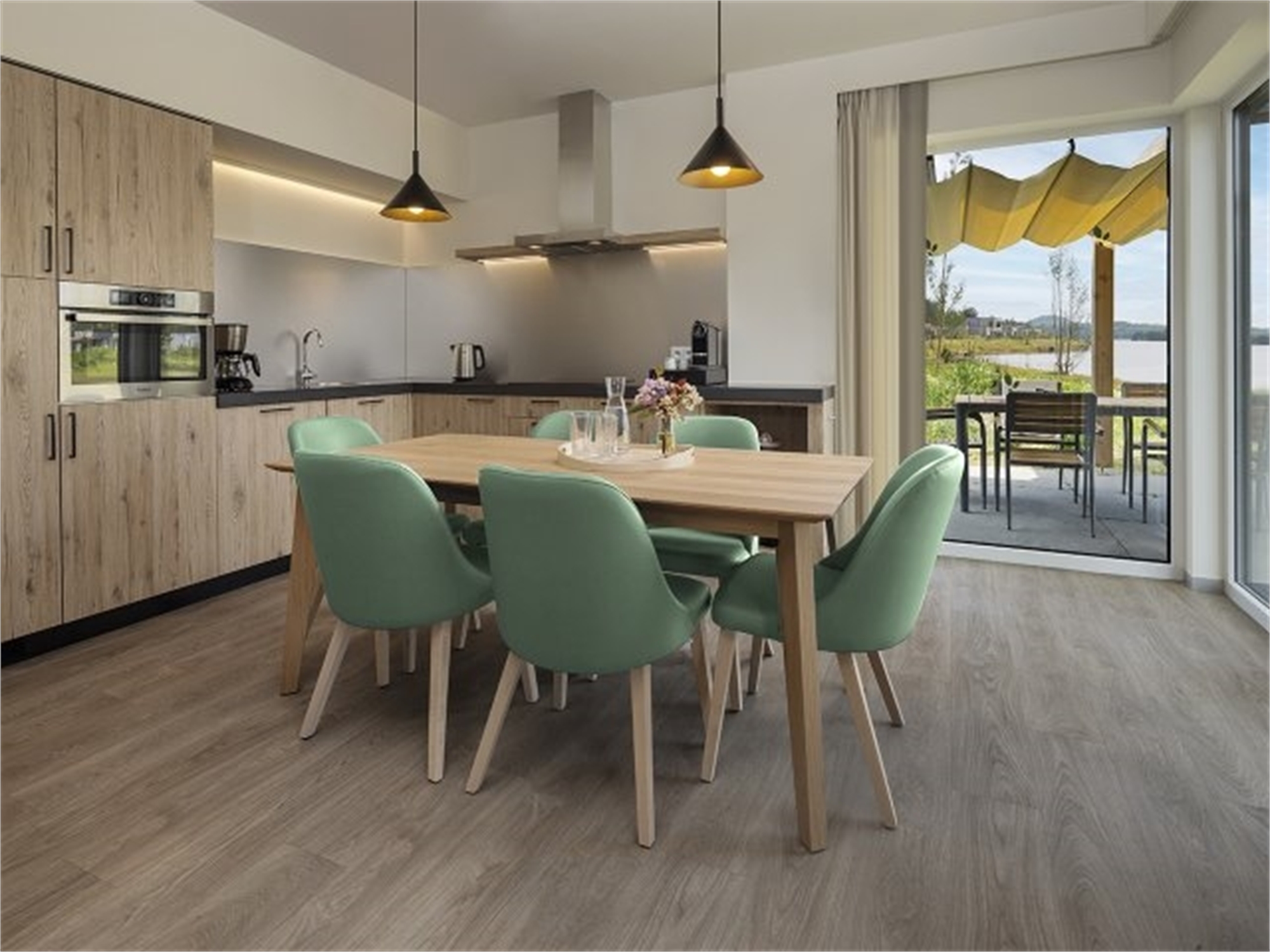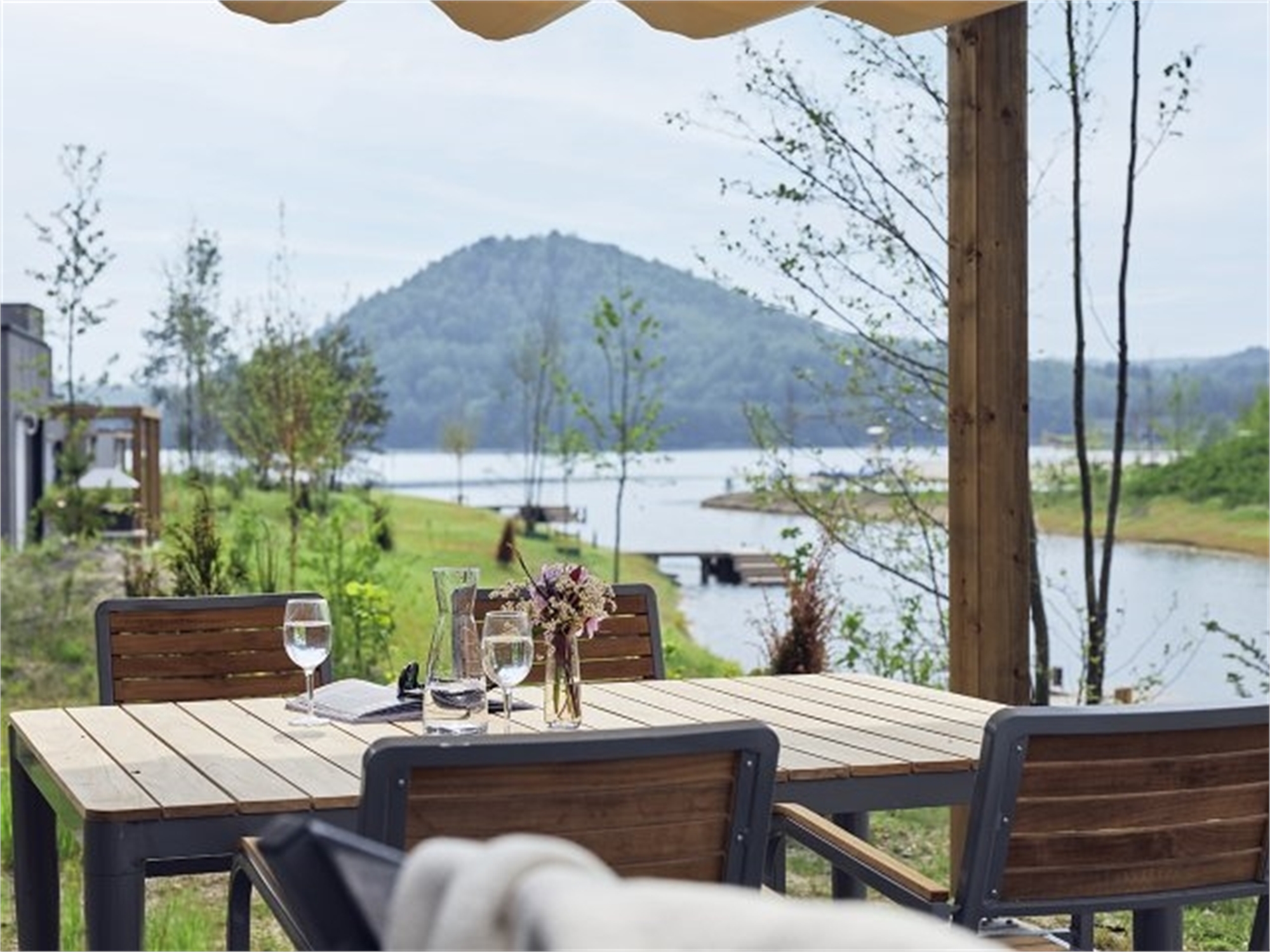 Von Ihrer überdachten Privatterrasse schweift Ihr Blick über den See. Alle Häuser des Typs Ferienhaus am See liegen direkt am Wasser. Das Panorama genießen Sie auch von innen durch die großen Fenster!