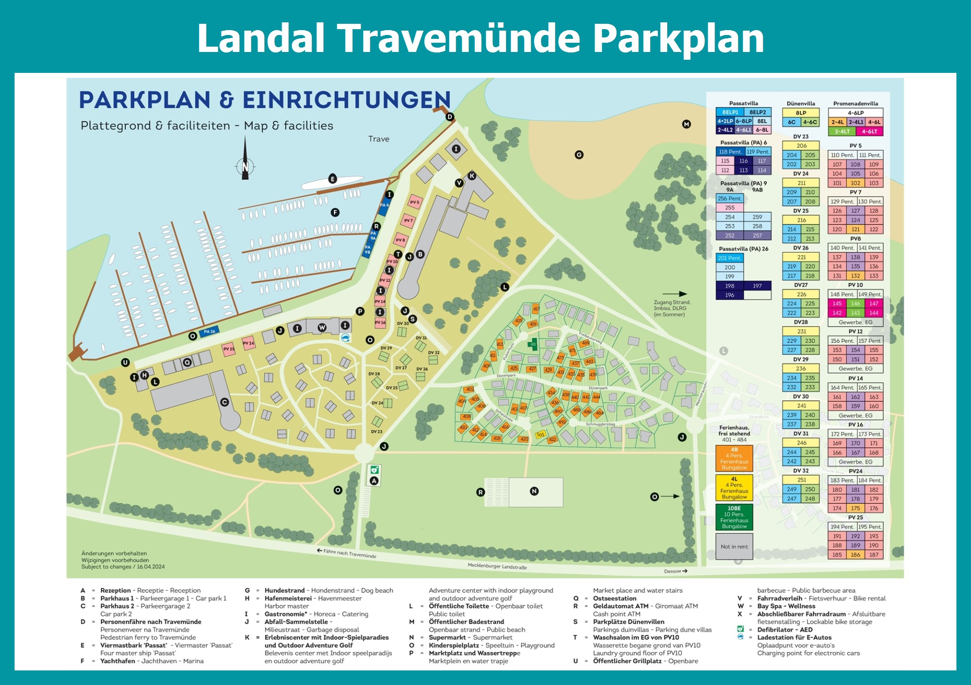 Aktueller und übersichtlicher Parkplan von Landal Travemünde mit alle Unterkünfte und Einrichtungen, auch als PDF herunterladbar.