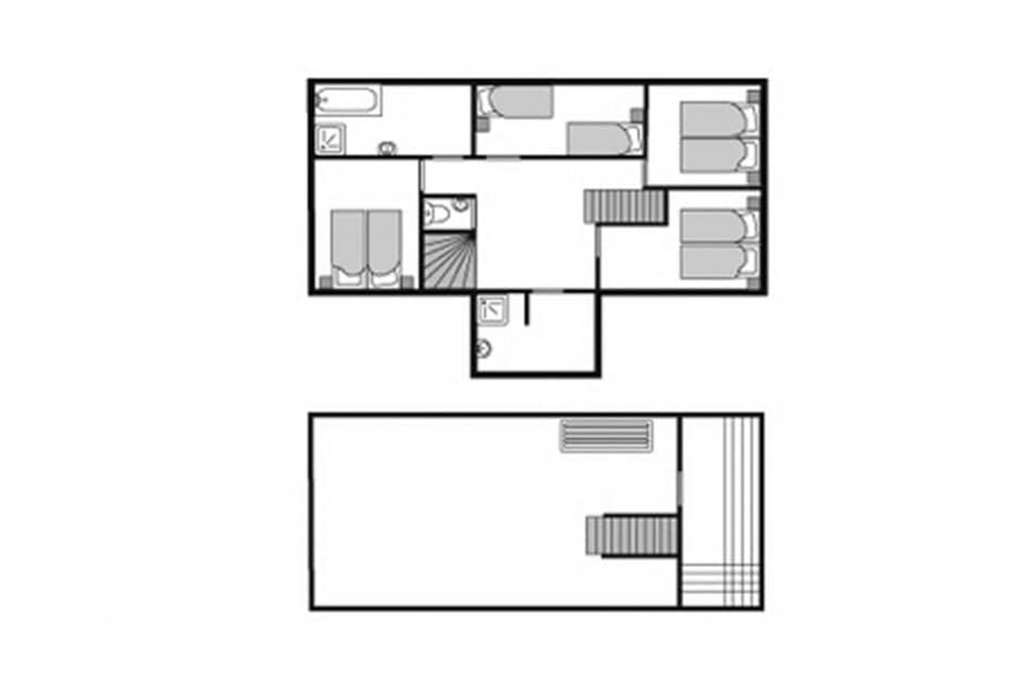 Obergeschoss: Vier Schlafzimmer mit jeweils zwei Einzelbetten. Zwei Badezimmer, davon eines mit Dusche und eines mit Dusche und Badewanne. Waschmaschine und Wäschetrockner. Toilette extra.