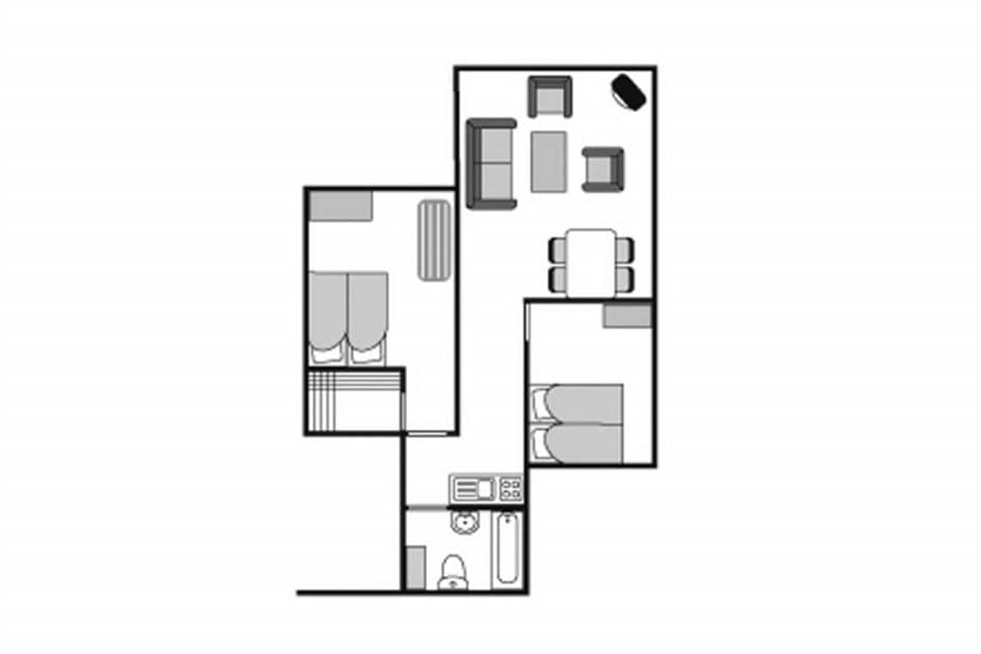 Einteilung: Wohnzimmer mit Flatscreen-TV und DVD-Spieler, offene Küche mit Kombimikrowelle, Kaffeepadmaschine und Spülmaschine. Badezimmer mit Badewanne oder Dusch, Waschtisch und Toilette. Zwei Schlafzimmer mit jeweils zwei Einzelbetten. Eines der Schlafzimmer verfügt über eine traditionelle Sauna und ein zweites TV-Gerät. Terrasse mit verstellbaren Gartenmöbeln mit Kissen.