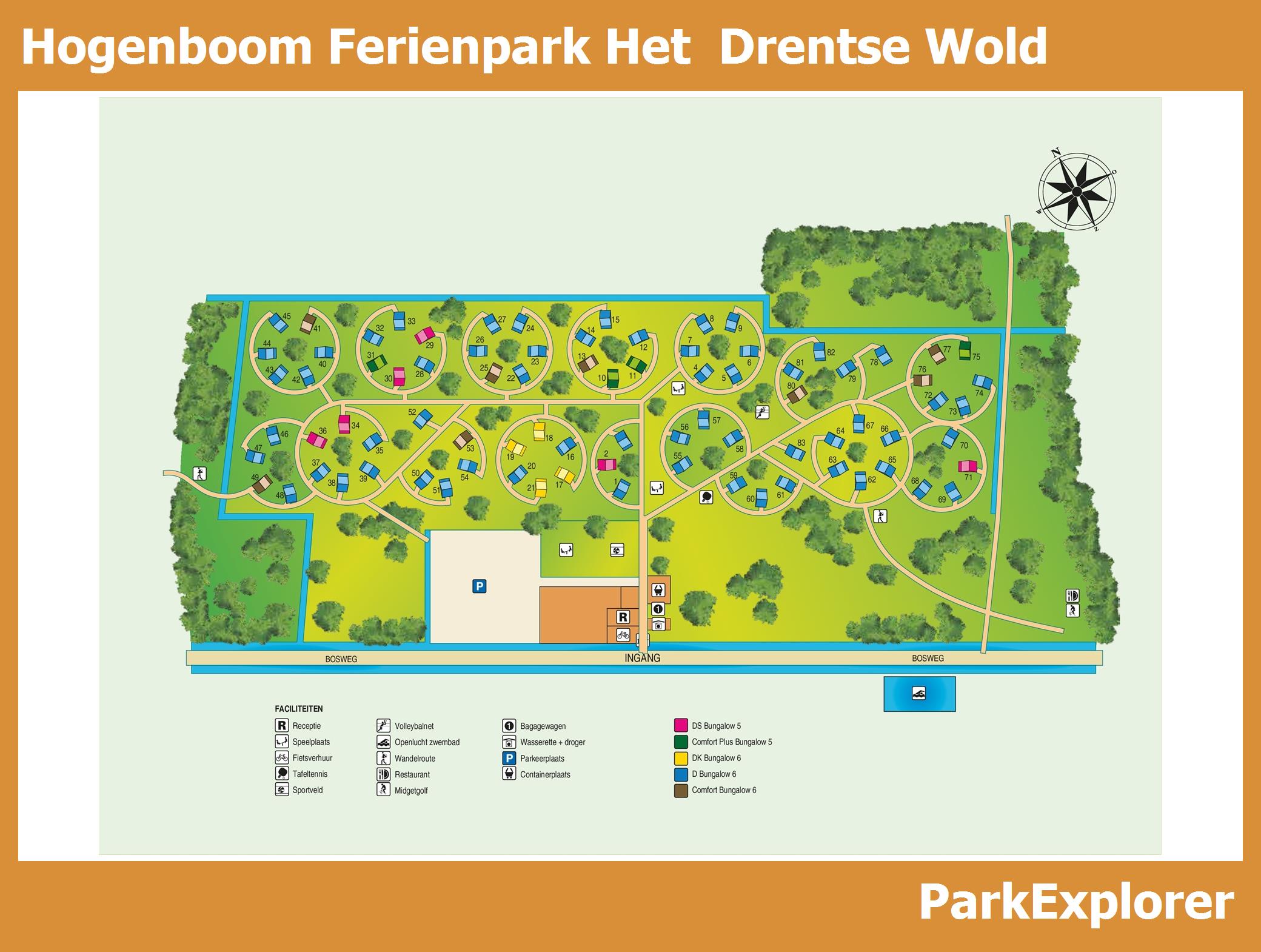 Aktueller und übersichtlicher Parkplan von Het Drentse Wold mit alle Unterkünfte und Einrichtungen, auch als PDF herunterladbar.