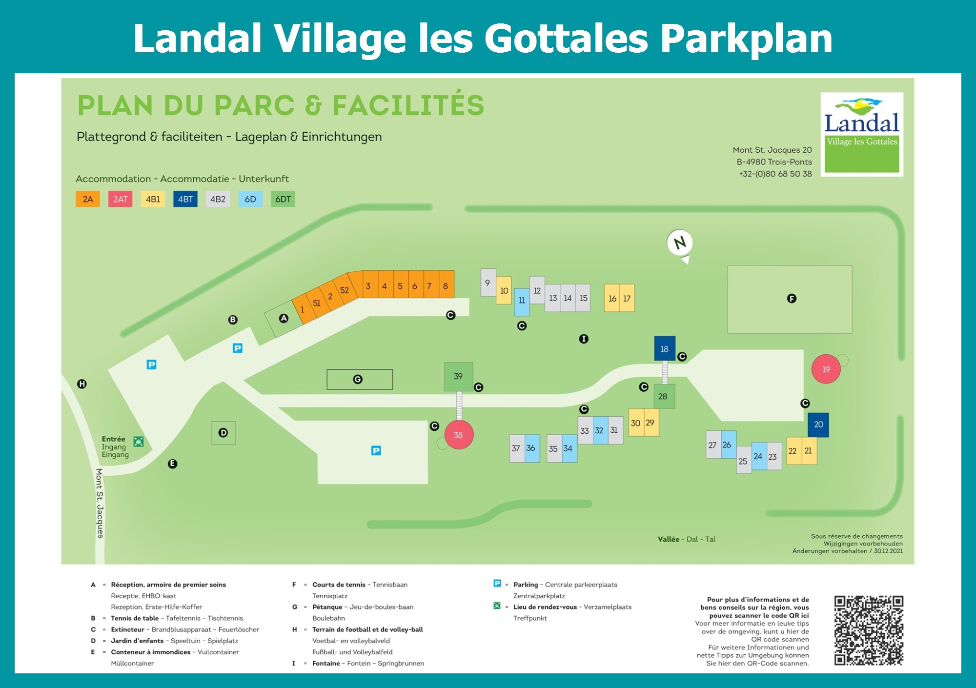 Aktueller und übersichtlicher Parkplan von Landal Village les Gottales mit alle Unterkünfte und Einrichtungen, auch als PDF herunterladbar.