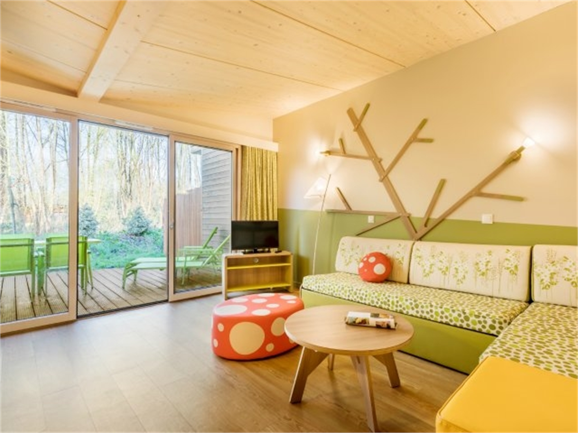 Wohnzimmer mit Flachbild-Fernseher. Große bodentiefe Fenster mit Blick auf die Holzterrasse, ausgestattet mit Gartenmöbeln