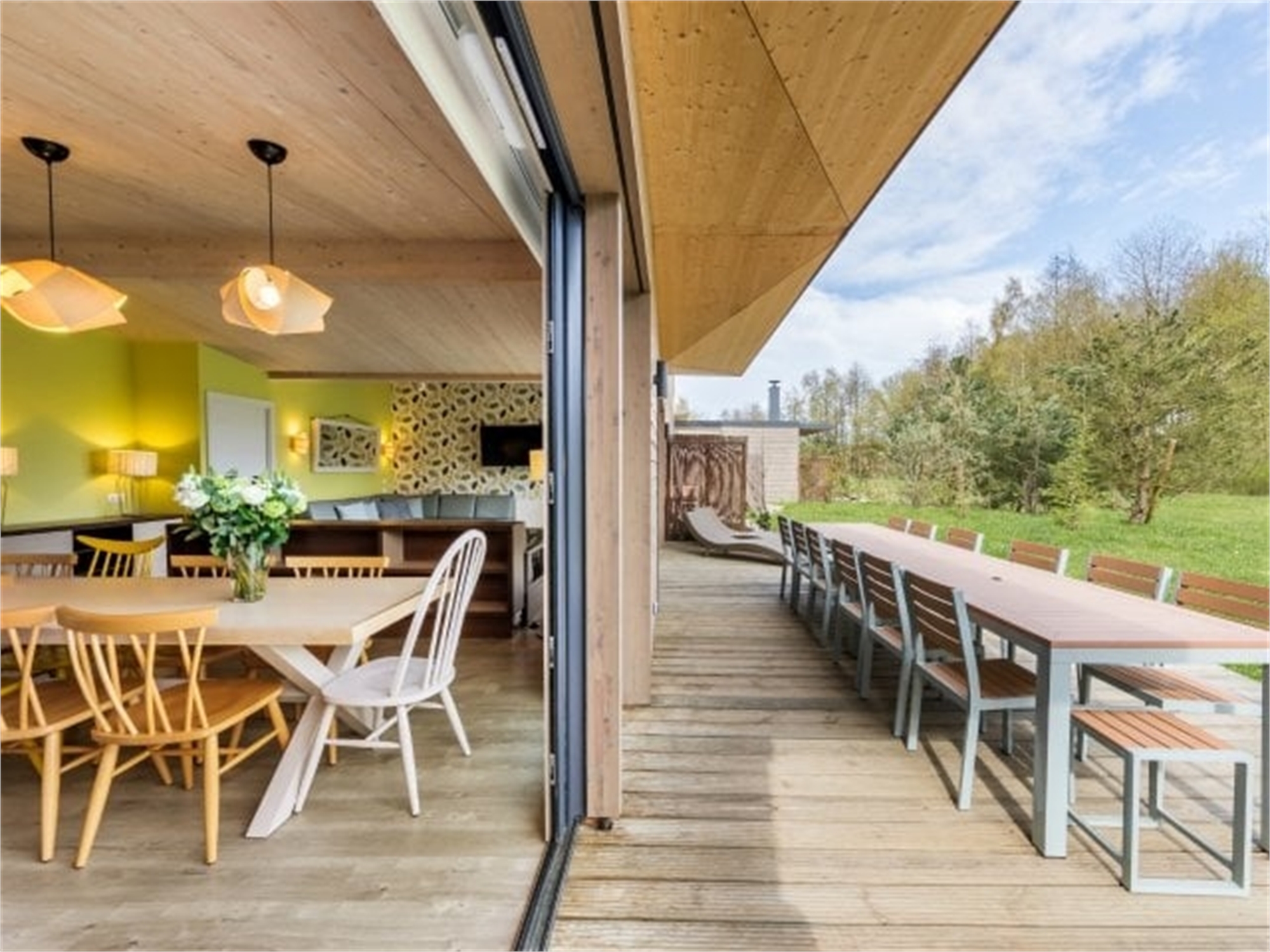 Wohnzimmer mit Offener Kamin, Flachbild-Fernseher. Große bodentiefe Fenster mit Blick auf die Holzterrasse, ausgestattet mit Gartenmöbeln