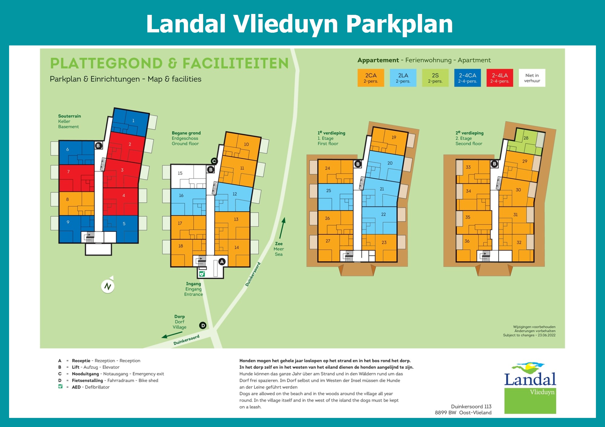 Aktueller und übersichtlicher Parkplan von Landal Vlieduyn mit alle Unterkünfte und Einrichtungen, auch als PDF herunterladbar.