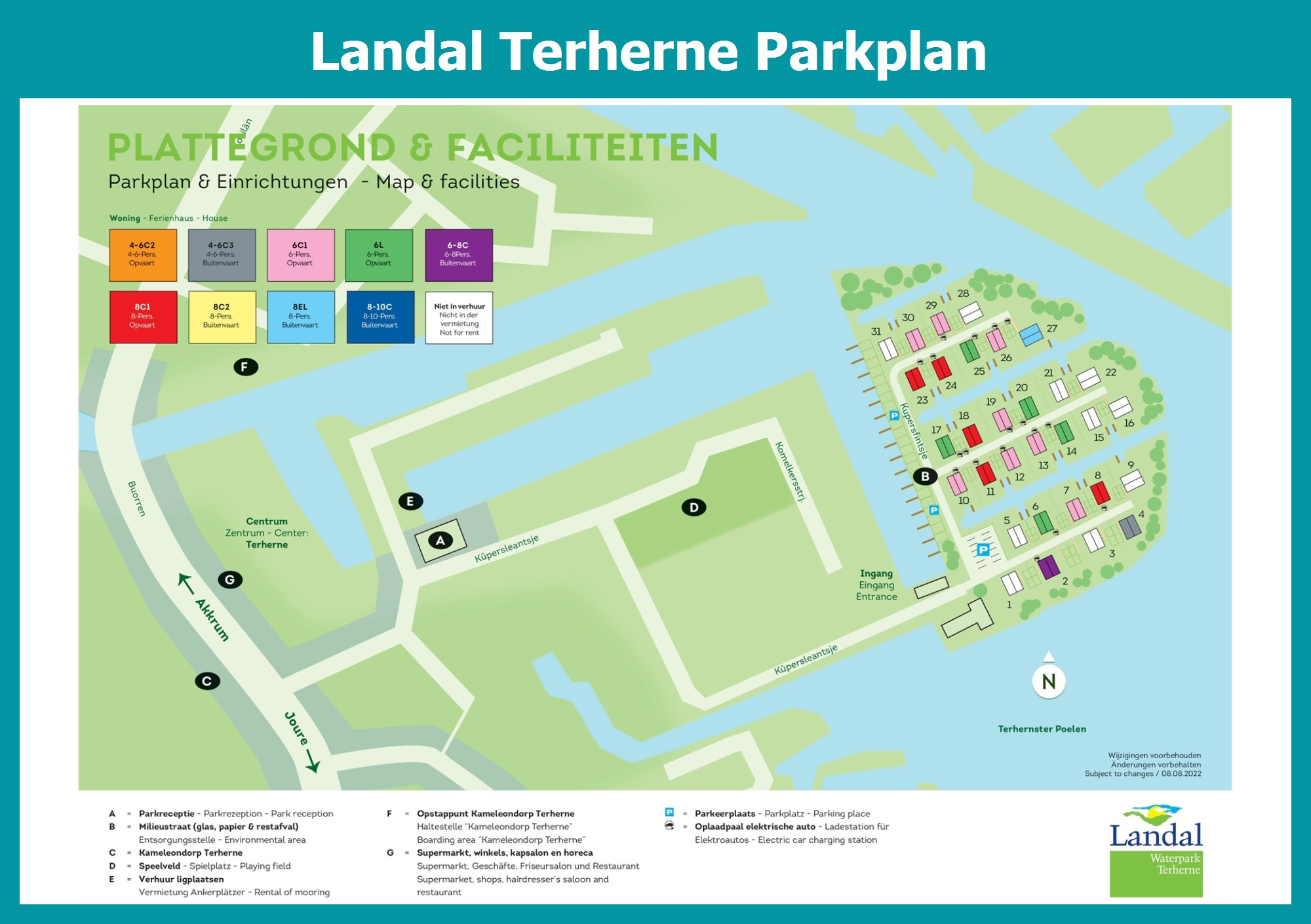 Aktueller und übersichtlicher Parkplan von Landal Terherne mit alle Unterkünfte und Einrichtungen, auch als PDF herunterladbar.
