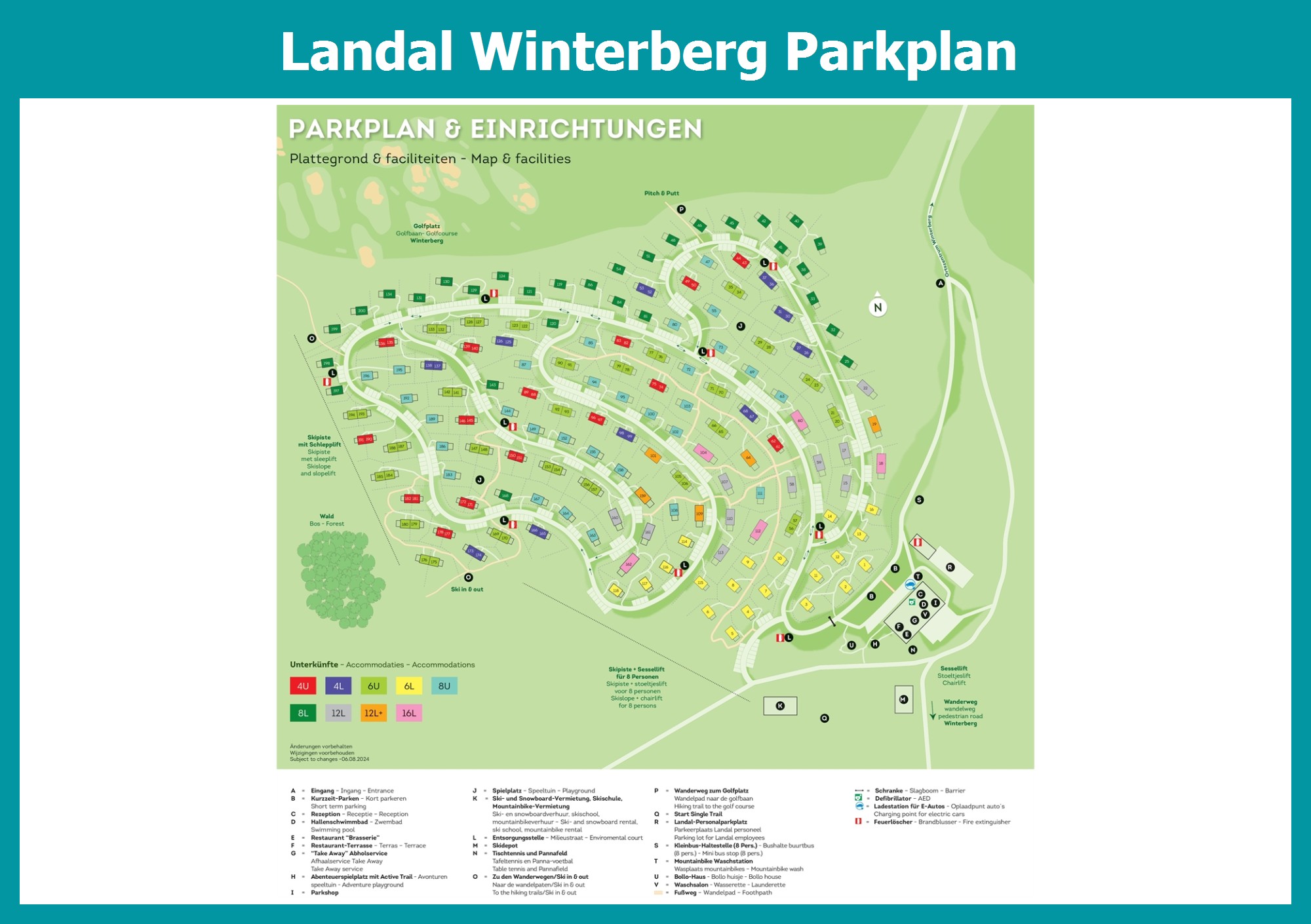Aktueller und übersichtlicher Parkplan von Landal Winterberg mit alle Unterkünfte und Einrichtungen, auch als PDF herunterladbar.