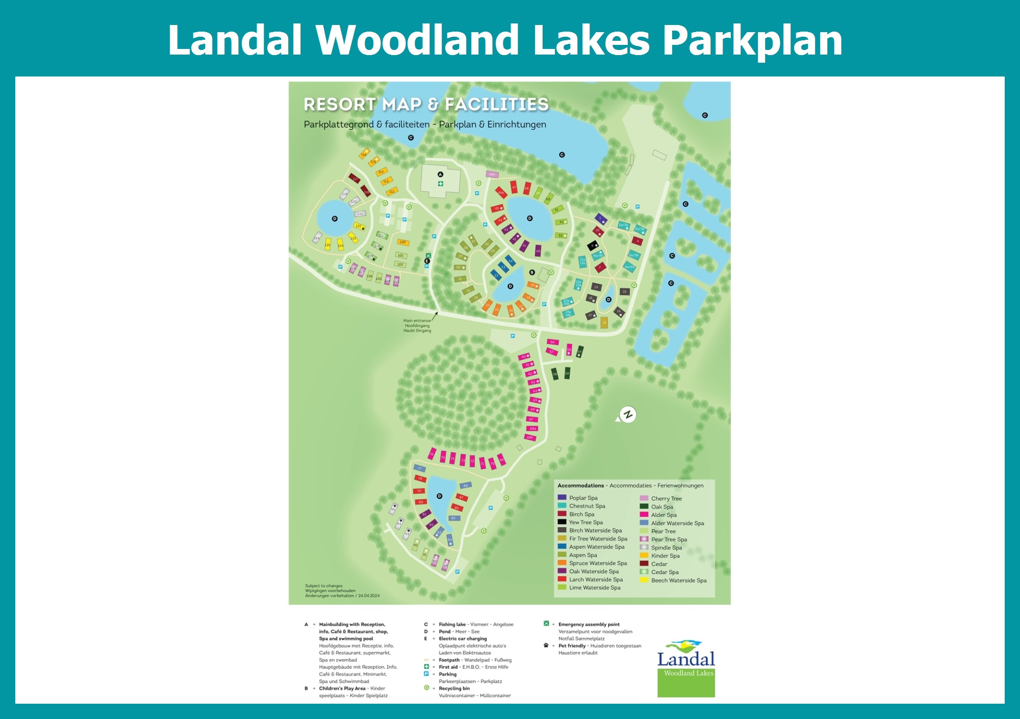 Aktueller und übersichtlicher Parkplan von Landal Woodland Lakes mit alle Unterkünfte und Einrichtungen, auch als PDF herunterladbar.