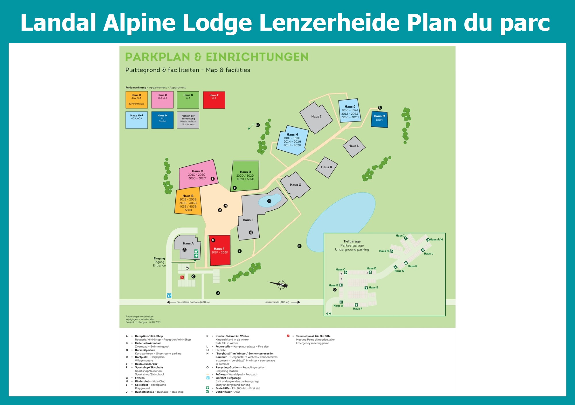 Le plan actuel du Landal Alpine Lodge Lenzerheide avec tous les hébergements et installations, est aussi disponible en pdf.