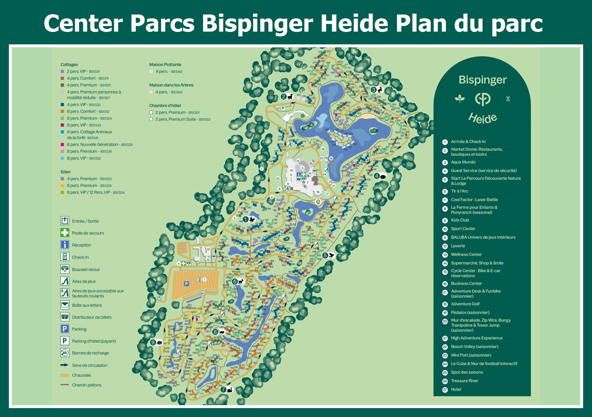 Le plan actuel du Center Parcs Bispinger Heide avec tous les hébergements et installations, est aussi disponible en pdf.