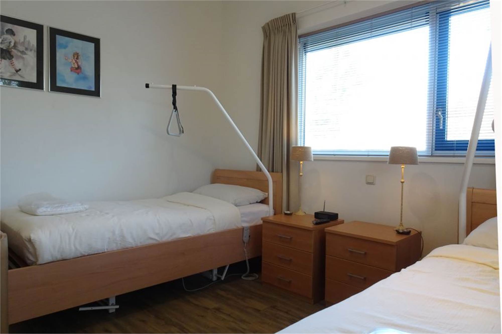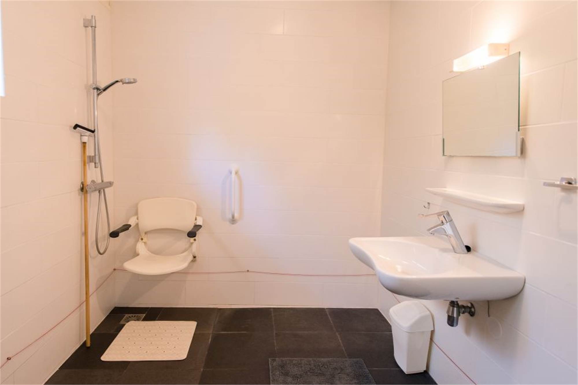 Ce logement est accessible aux personnes à mobilité réduite. Il y a une chambre avec deux lits de soins avec sommier à lattes électrique, réglable et 'perroquet'. La salle de bain a des toilettes adaptées ainsi qu’une douche avec siège de douche, lavabo pour les utilisateurs de fauteuils roulants et un miroir mobile. La cuisine est équipée n’a pas de placards supérieurs et la salle de séjour est aménagée de façon à avir beaucoup d’espace pour se déplacer. Le logement est situé près du parking.