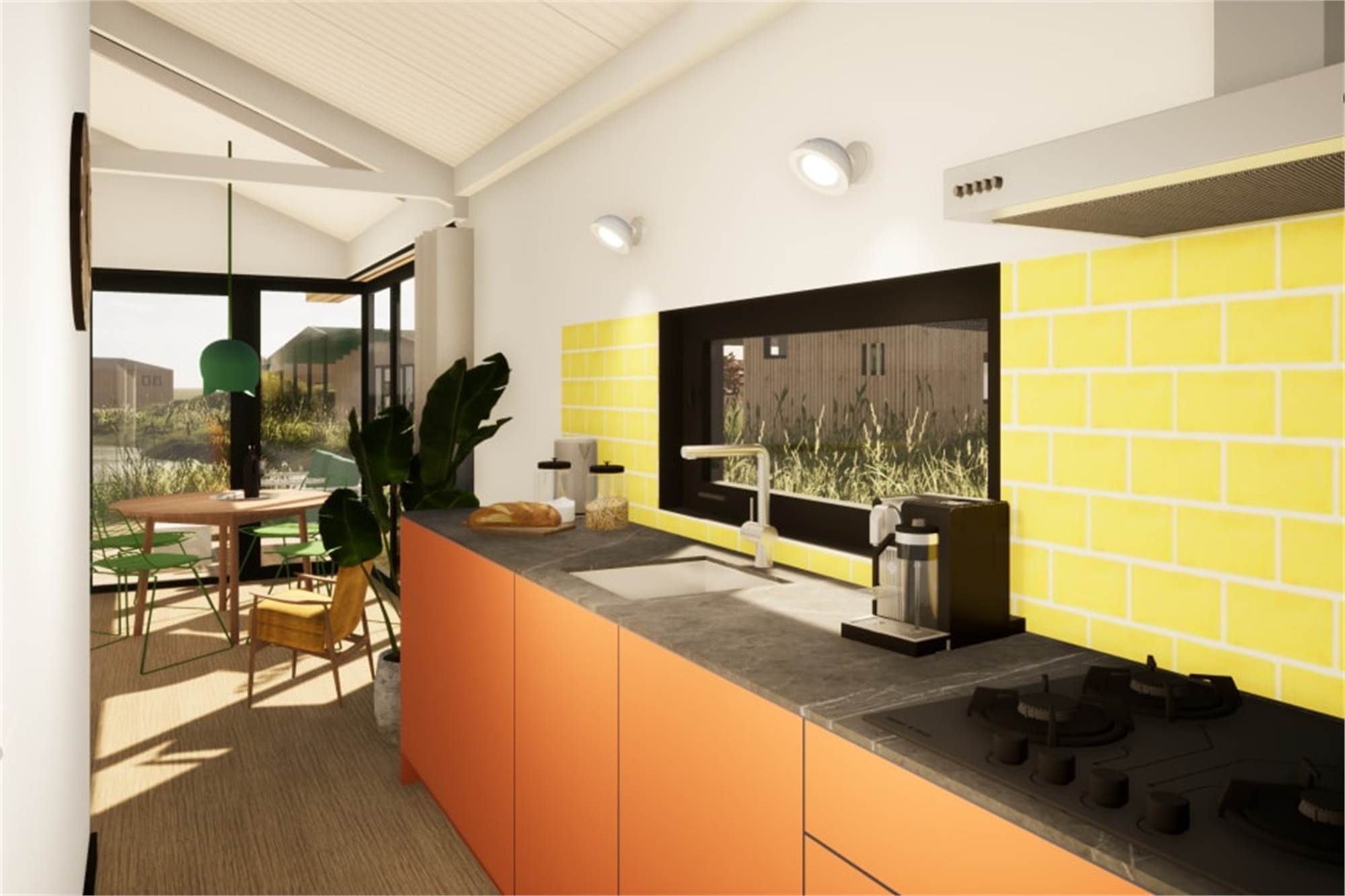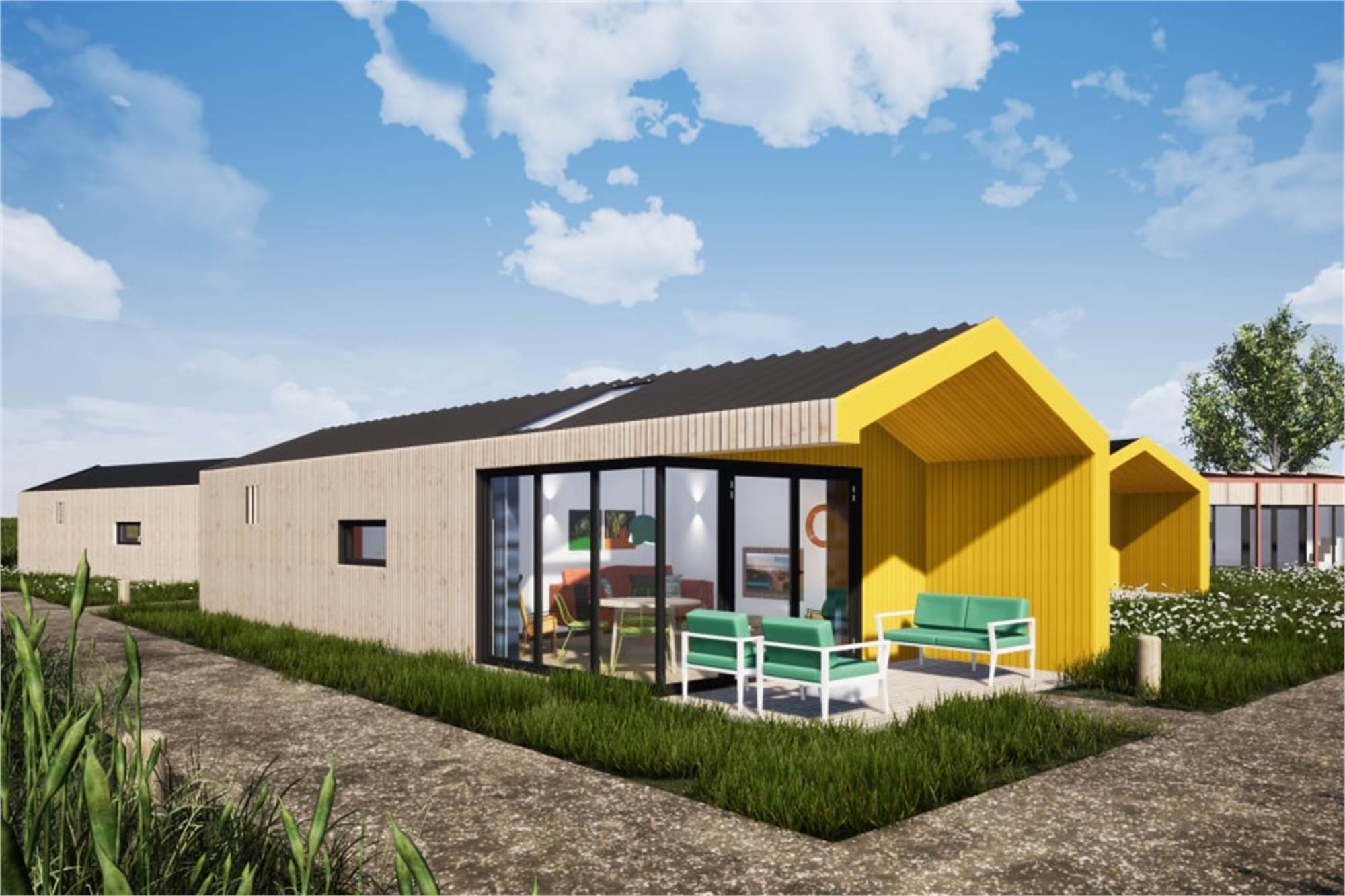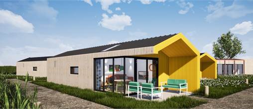 Ce lodge indépendant peut accueillir 4 personnes. La salle de séjour a un coin salon, une smart-TV et un coin repas. La cuisine est équipée d'un lave-vaisselle, d'un réfrigérateur avec compartiment congélateur, d'un micro-ondes, d'une machine à café et d'une bouilloire. Il y a 2 chambres à coucher, chacune avec 2 lits simples. La chambre à coucher permet d'accueillir un lit d'enfant supplémentaire. La salle de bains se compose d'un lavabo et d'une douche à l'italienne. Il y a également des toilettes séparées. Le lodge dispose d'un jardin avec pergola et un ensemble lounge. Tout le lodge est équipé du chauffage au sol et du wifi gratuit.