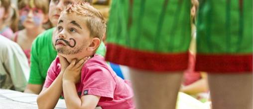 Les enfants attendent fébrilement que le rideau du théâtre de marionnettes s'ouvre. L'histoire peut enfin commencer ! Comme en témoignent leurs rires et leurs cris, ils vivent l'histoire avec passion.