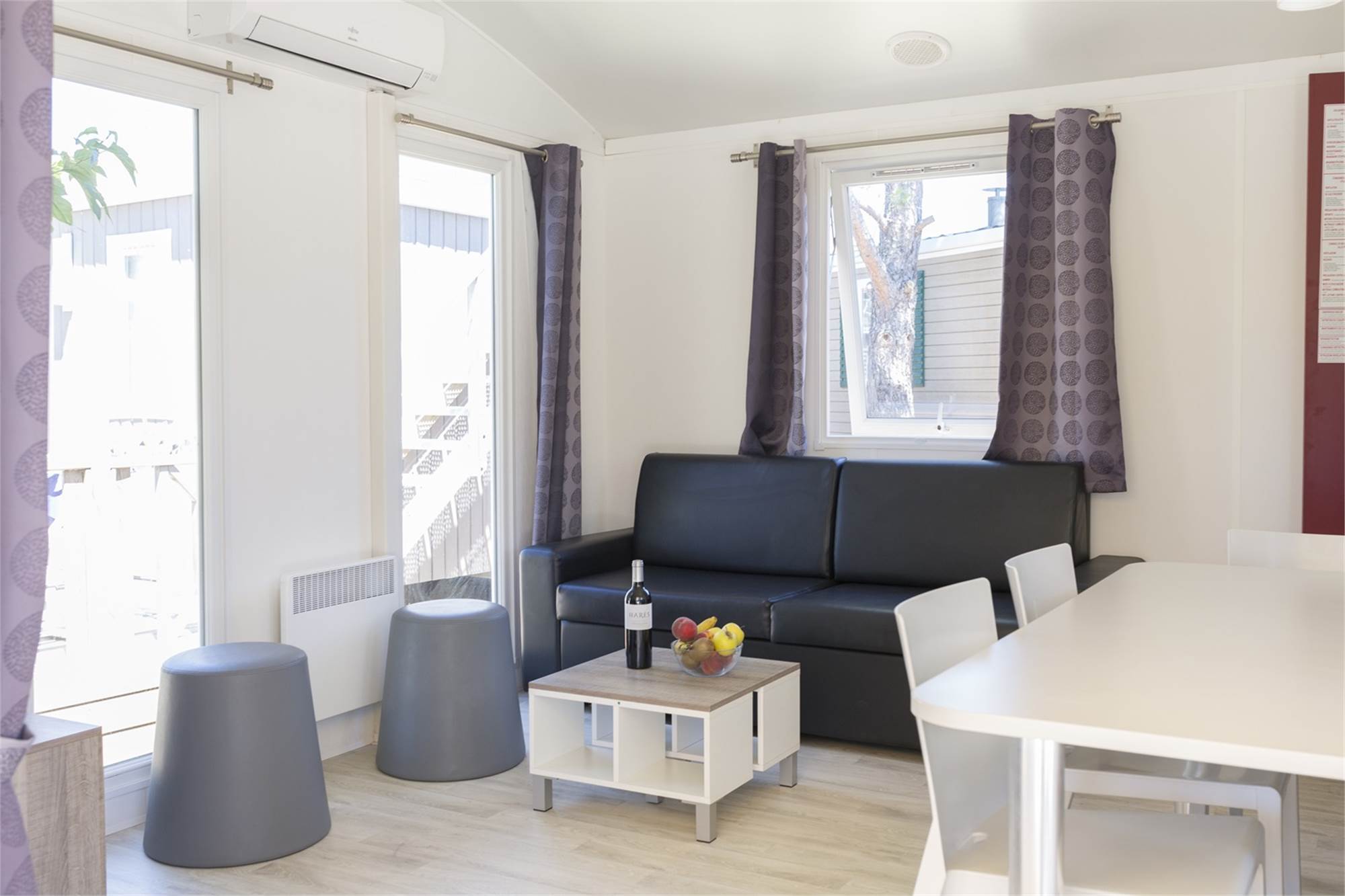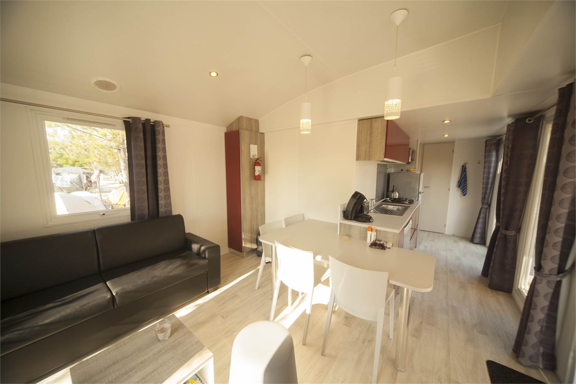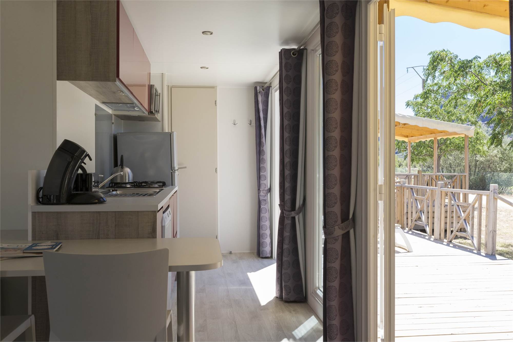 Generalite/Situation Amenagements Specifiques Portes donnant sur la terrasse Coin-repas pour 4 personnes Doubles portes donnant sur la terra Poêle électrique Air conditionné Mobilier de jardin Mobilier de jardin Parking près de l'hébergement Terrasse en bois véranda Transats Audio/Video/Electronique Accès Wifi sur tout le camping Cuisine Cuisine américaine basique Hotte aspirante Cuisine américaine moderne Plaque de cuisson à 4 feux (gaz) Lave-vaisselle cafetière Senseo Combiné four/ micro-ondes Chambre Couettes Nombre de chambres: 2 Sanitaires Douche Toilettes séparées Lavabo dans la salle de bains Caracteristiques Specifiques Animaux domestiques Non fumeurs