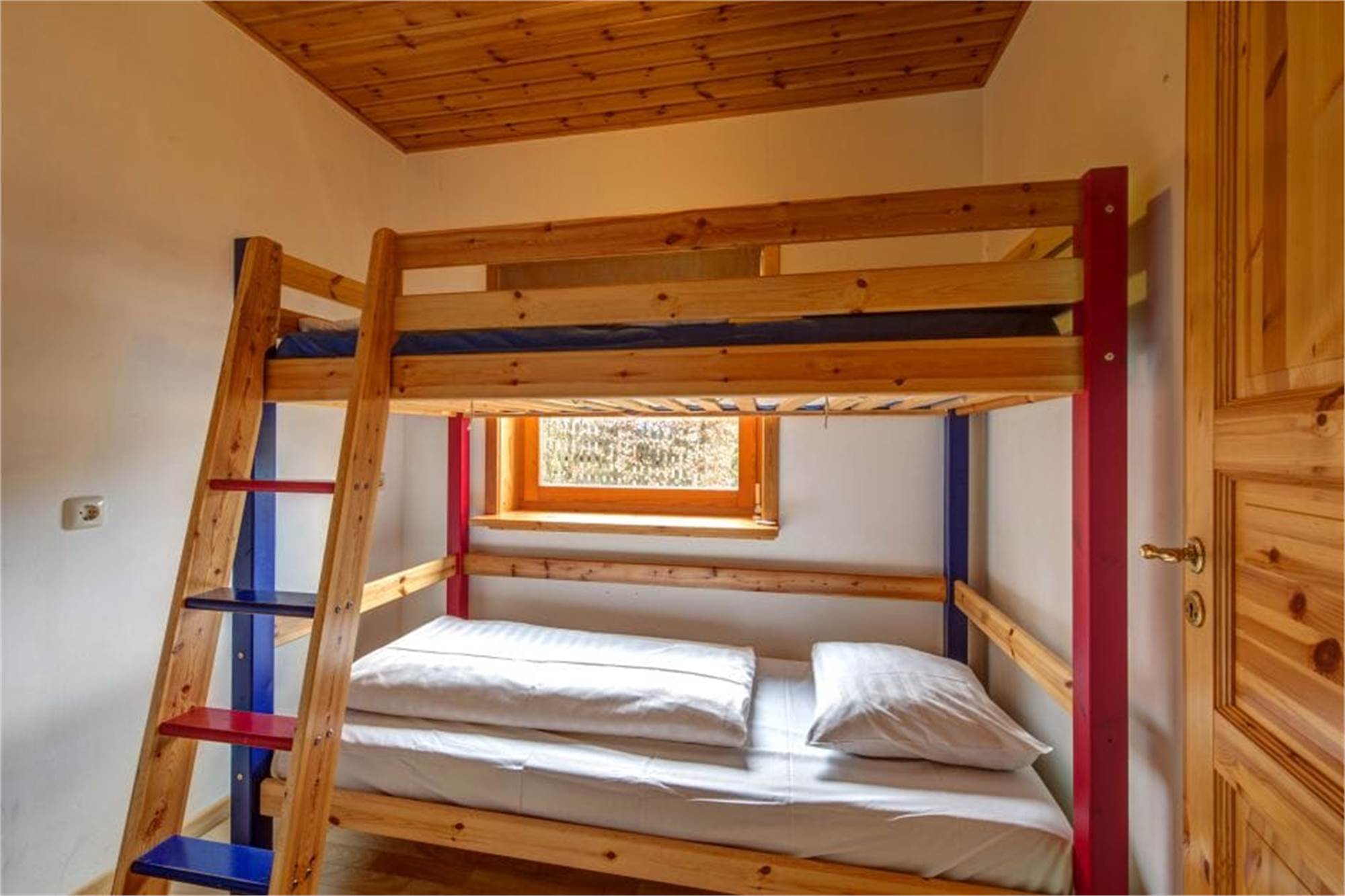 À l'étage : quatre chambres, deux avec deux lits simples chacune et deux avec trois lits simples chacune. Salle de bains avec toilettes, cabine de douche et lavabo. Rangements.