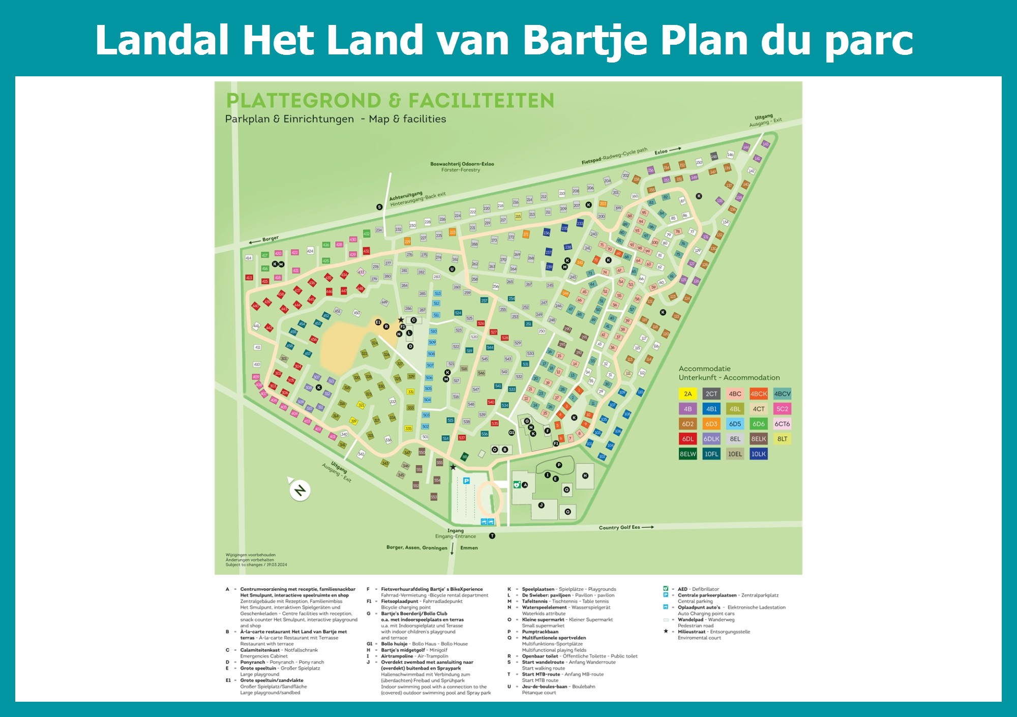 Le plan actuel du Landal Het Land van Bartje avec tous les hébergements et installations, est aussi disponible en pdf.