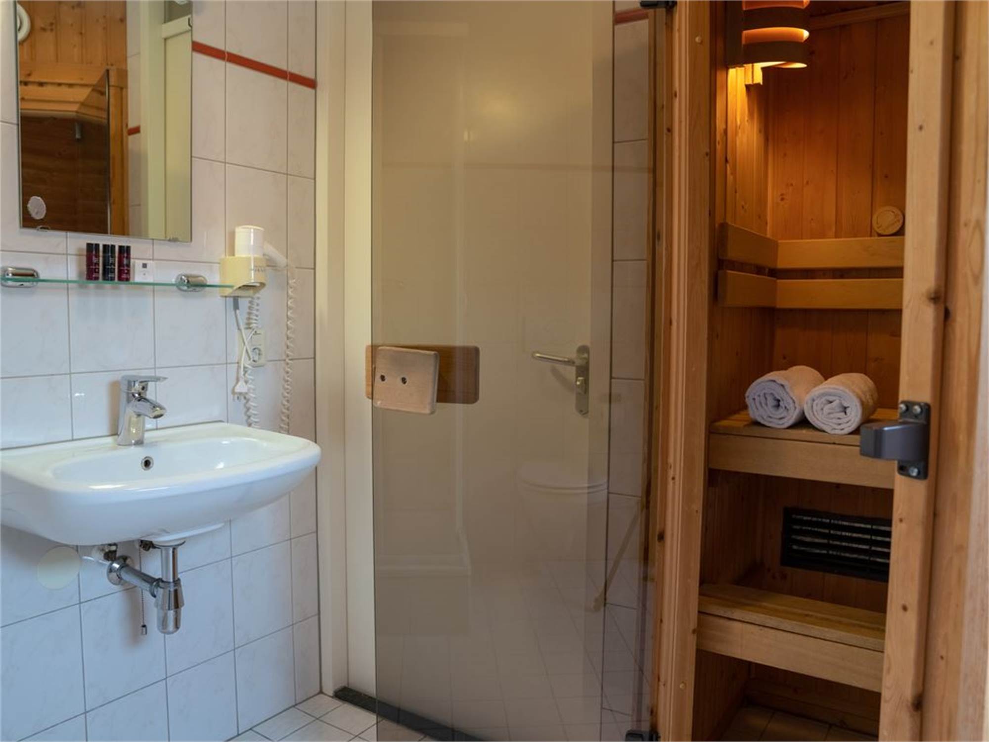 Salle de bains avec cabine de douche, double lavabo et toilette