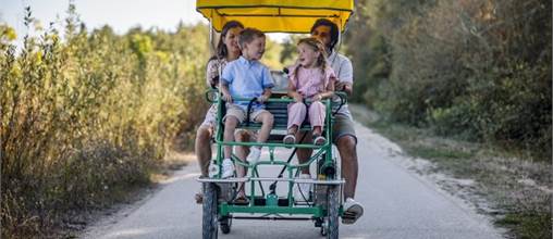 Prêts pour une véritable aventure à vélo avec toute la famille ? Prenez place à bord du Family Bike. Petits et grands, à vos pédales ! 3,2,1 ... partez ! La rosalie peut accueillir 2 adultes et deux enfants de moins de 7 ans.