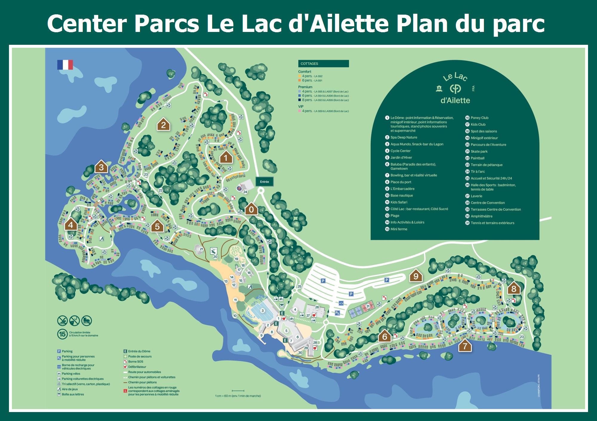 Le plan actuel du Center Parcs Le Lac d'Ailette avec tous les hébergements et installations, est aussi disponible en pdf.