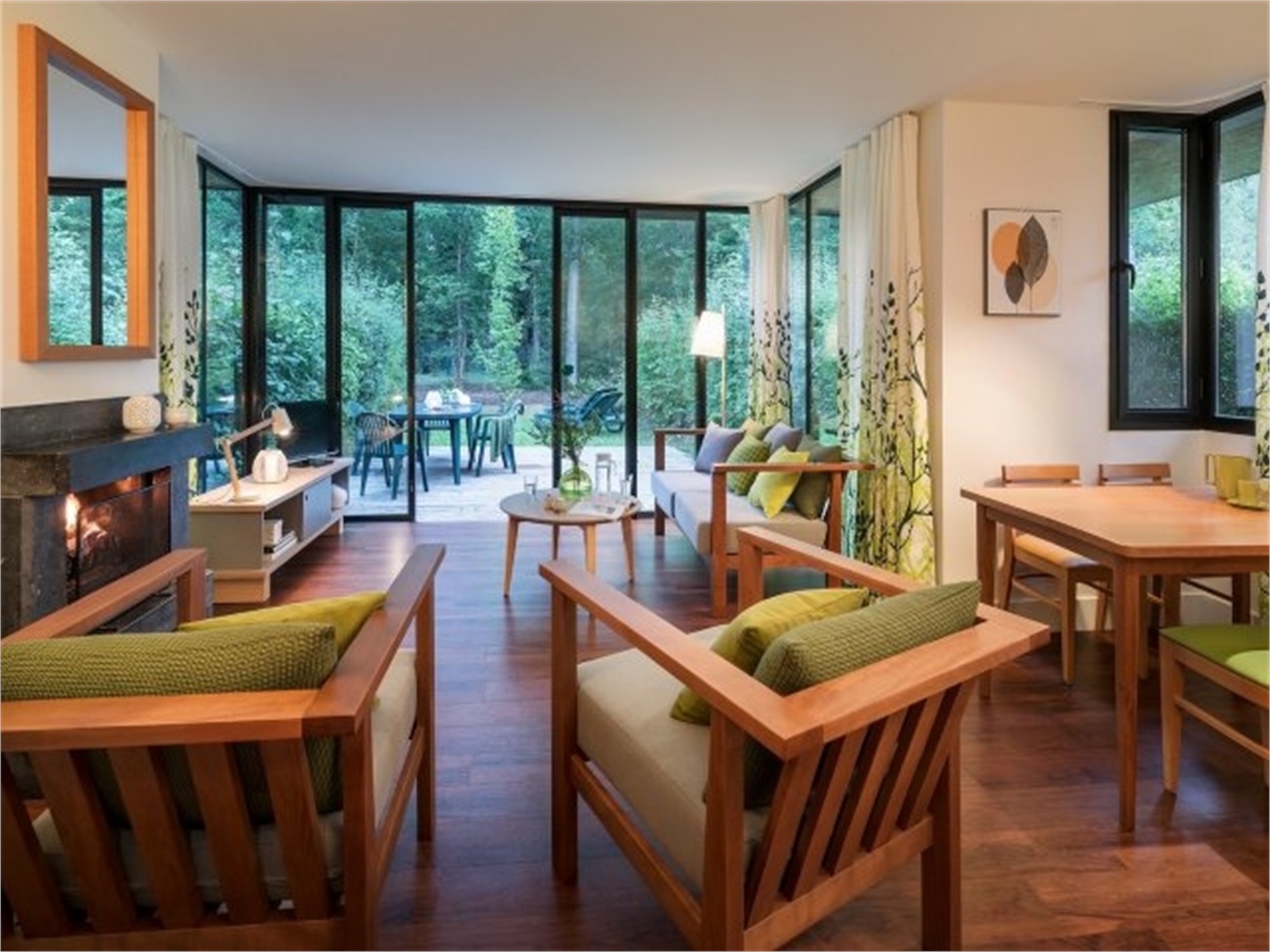 Le nom dit tout : en raison de son architecture particulière, le cottage Pagode a une forme orientale. Grâce à ses grandes fenêtres, qui sont aussi larges que la pièce et vont du sol au plafond, le cottage est ouvert et lumineux, vous offrant une vue magnifique sur la nature environnante.