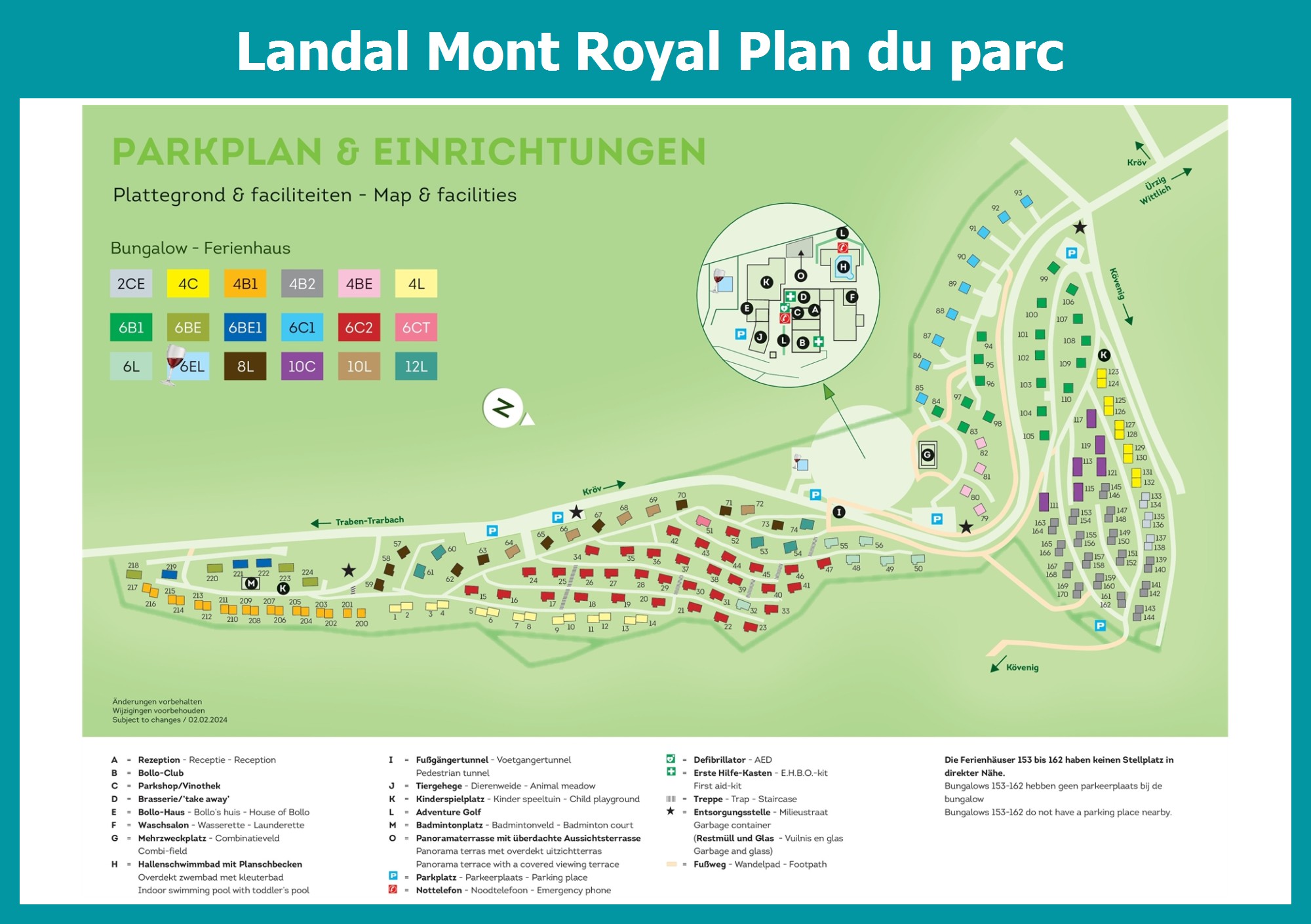 Le plan actuel du Landal Mont Royal avec tous les hébergements et installations, est aussi disponible en pdf.