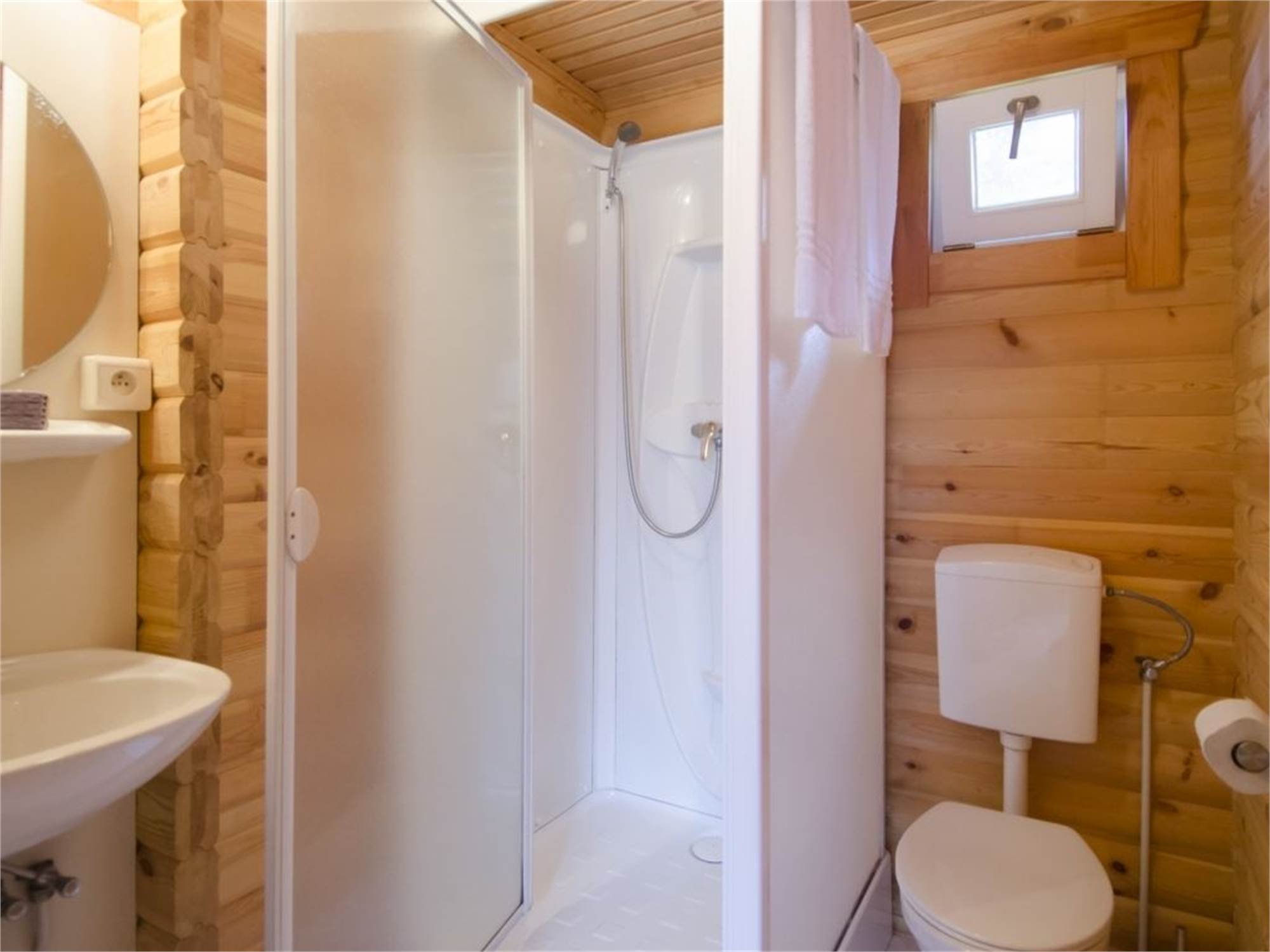 Salle de bains avec cabine de douche, lavabo et toilette