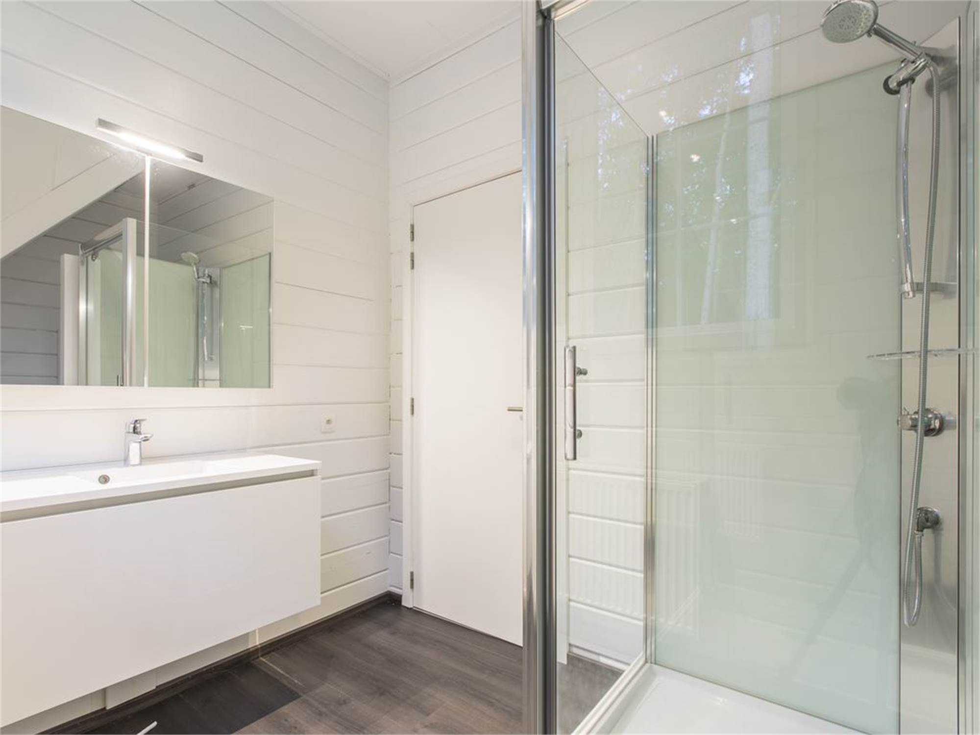 Salle de bains avec cabine de douche, lavabo et toilette