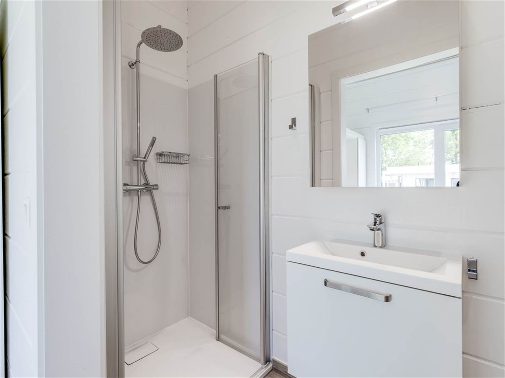 Salle de bains avec cabine de douche, lavabo et toilette
