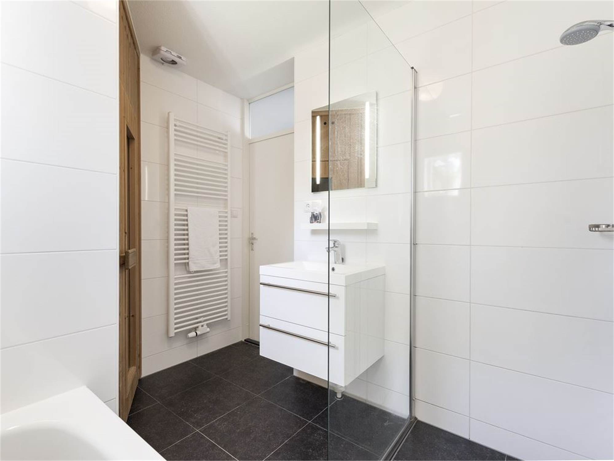 Salle de bains avec baignoire, cabine de douche et lavabo