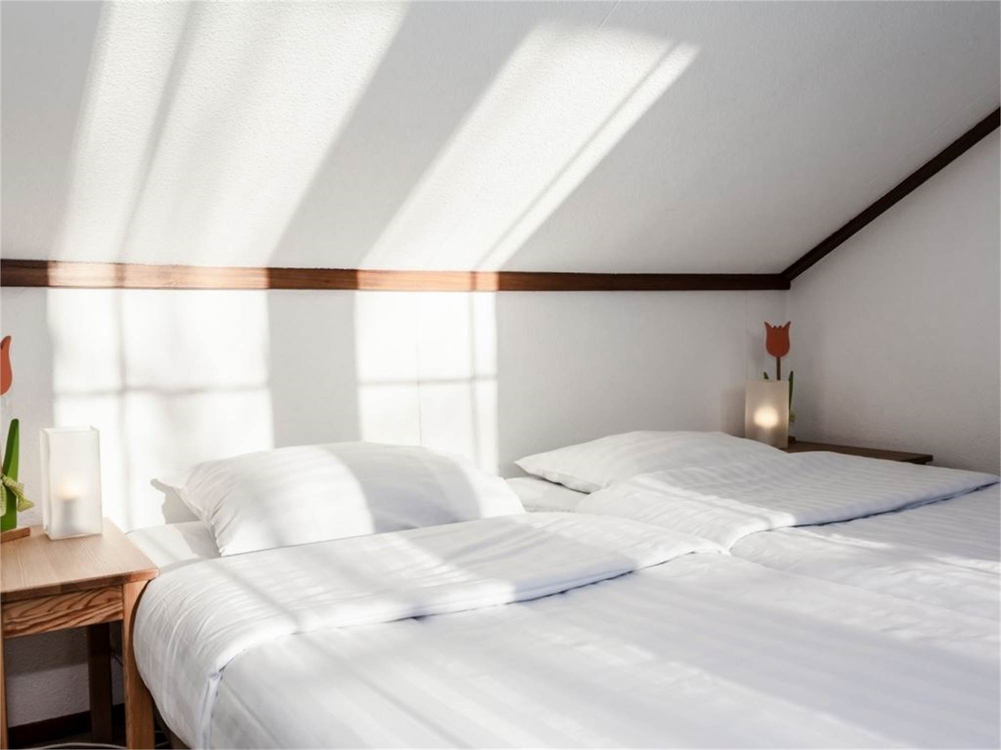 Chambre à coucher avec deux lits 1 personne et couvre-matelas softtoper au premier étage