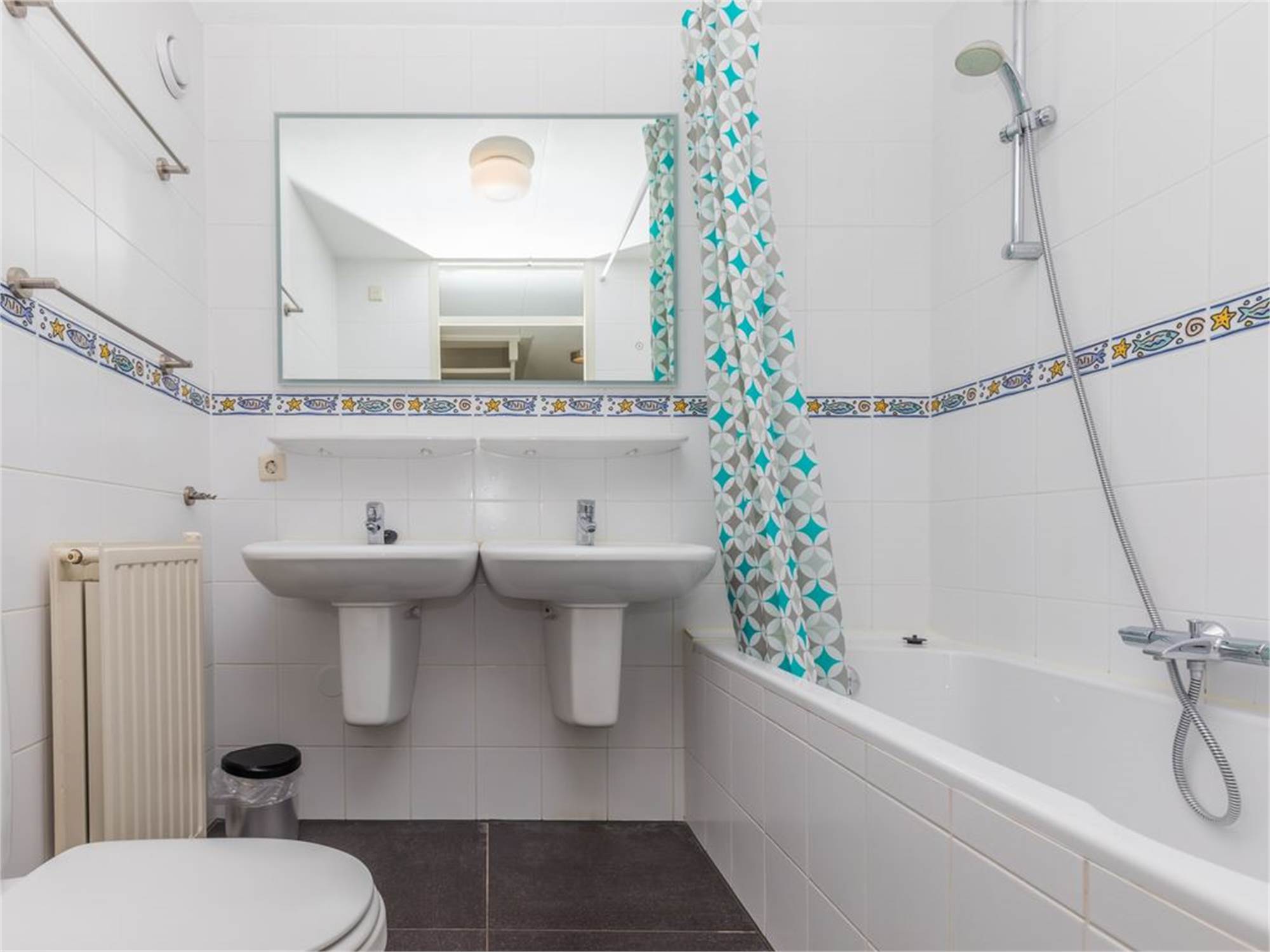Salle de bains avec baignoire, double lavabo et toilette