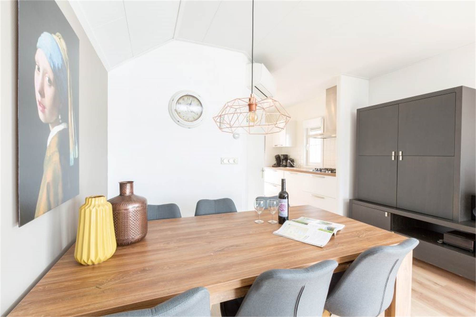 Agencement : grand salon avec air conditionné, télévision allemande, TV à écran plat, lecteur dvd et Wifi gratuit. Une cuisine ouverte de luxe avec micro-ondes combiné, réfrigérateur-congélateur et lave-vaisselle.