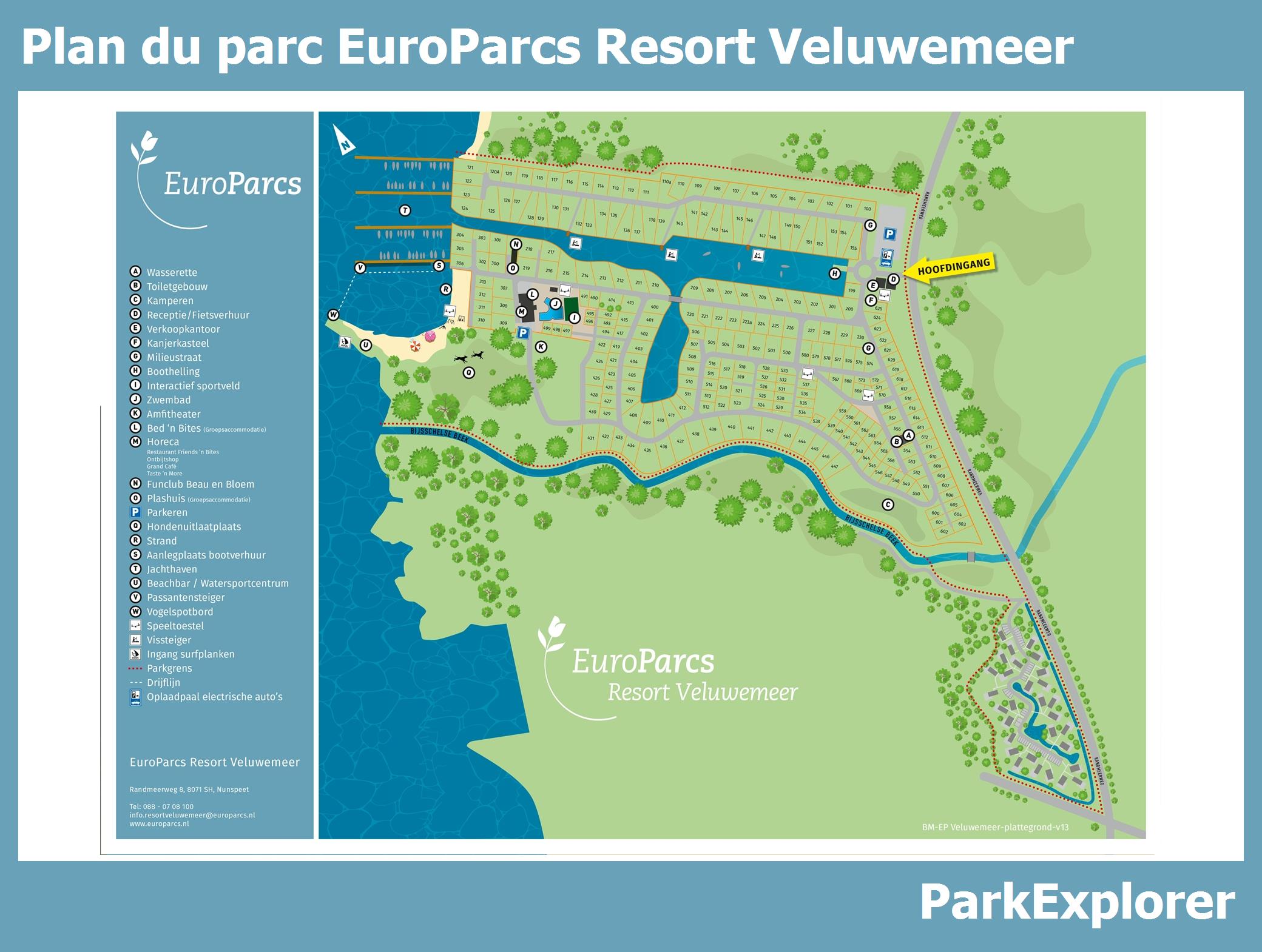 Le plan actuel du EuroParcs Veluwemeer avec tous les hébergements et installations, est aussi disponible en pdf.