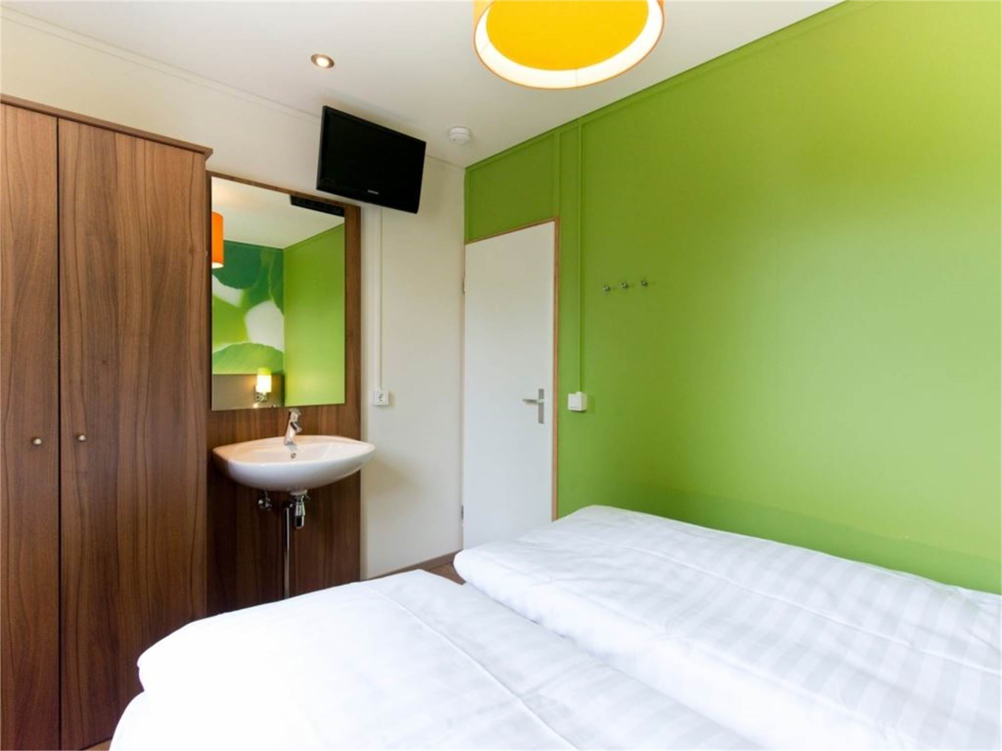Chambre à coucher avec deux lits boxspring pour 1 personne, surmatelas pour 2 personnes, lavabo et téléviseur à écran plat