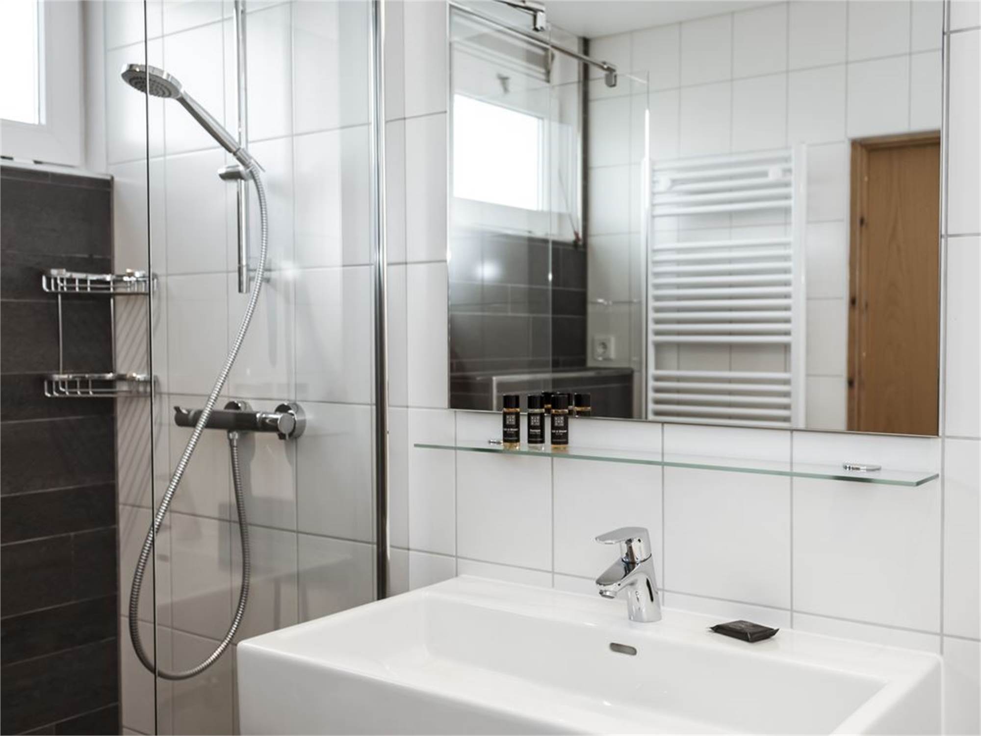 Chambre à coucher avec deux lits boxspring pour 1 personne, surmatelas pour 2 personnes, lavabo et téléviseur à écran plat