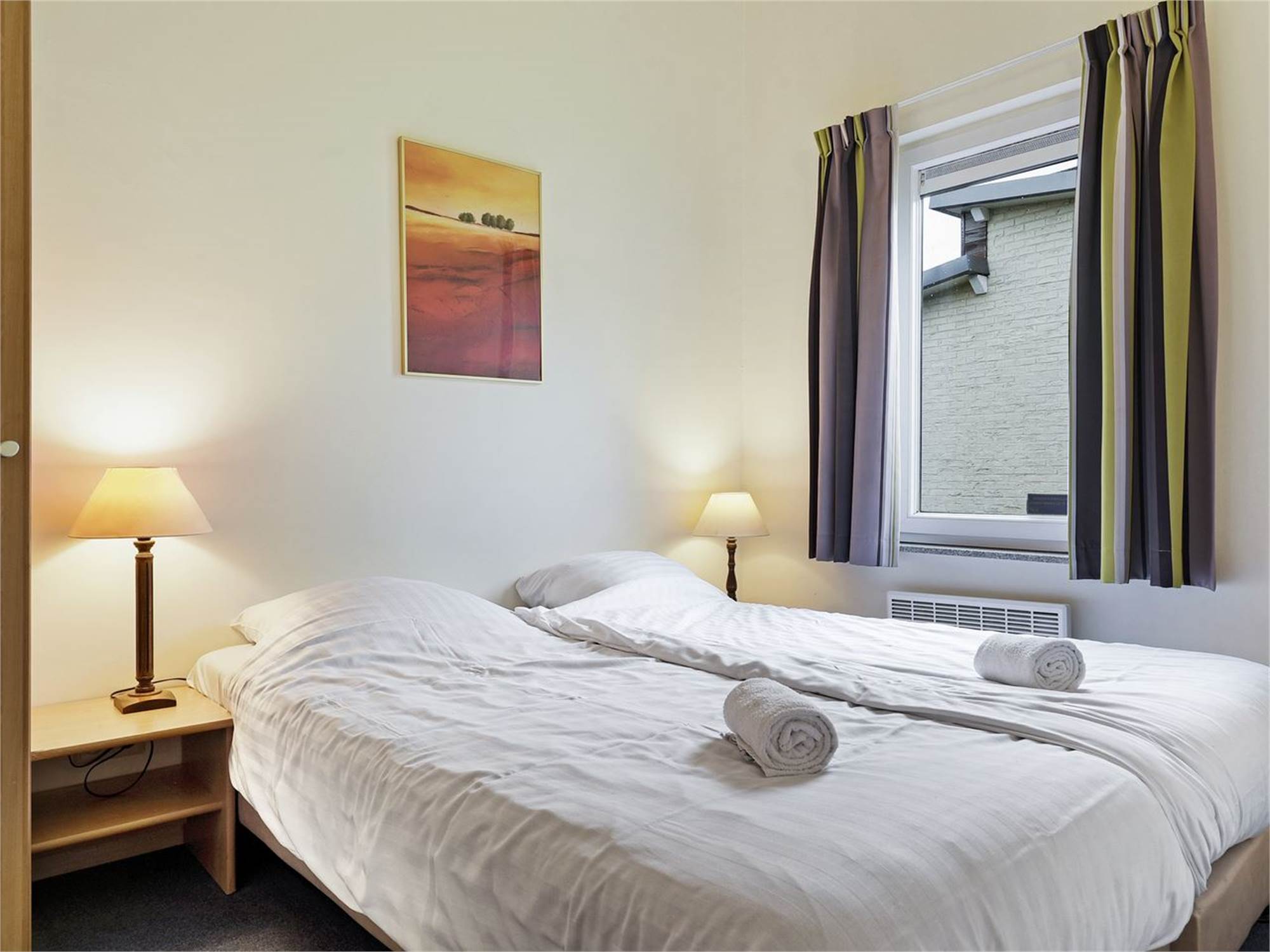 Chambre à coucher avec deux lits boxspring pour 1 personne, surmatelas et téléviseur