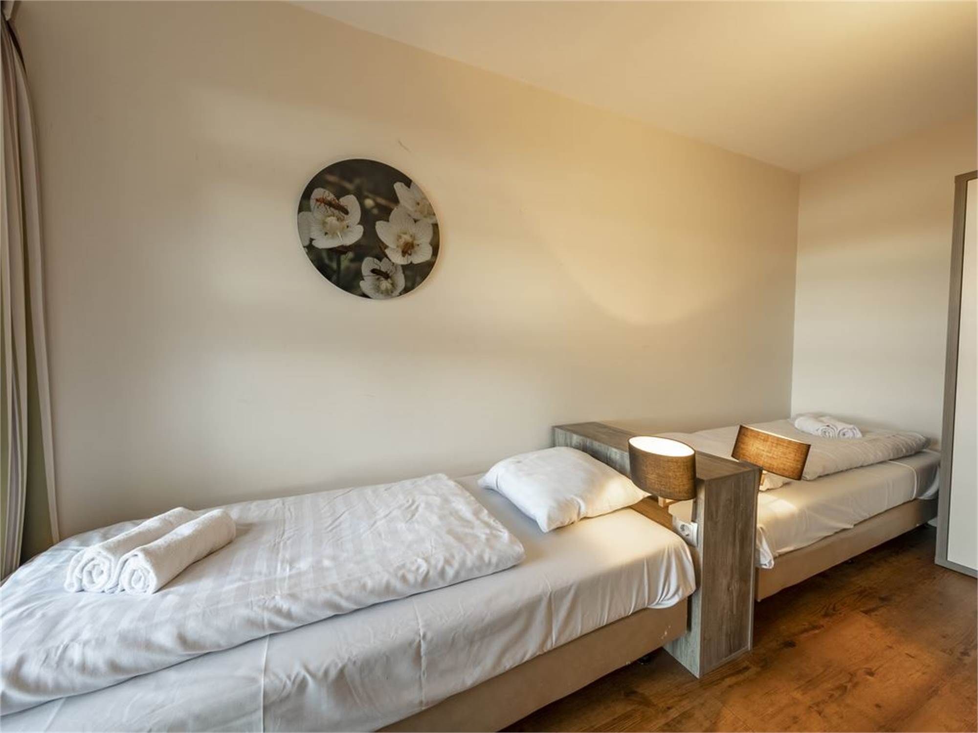 Chambre à coucher avec deux lits boxspring pour 1 personne, surmatelas et téléviseur